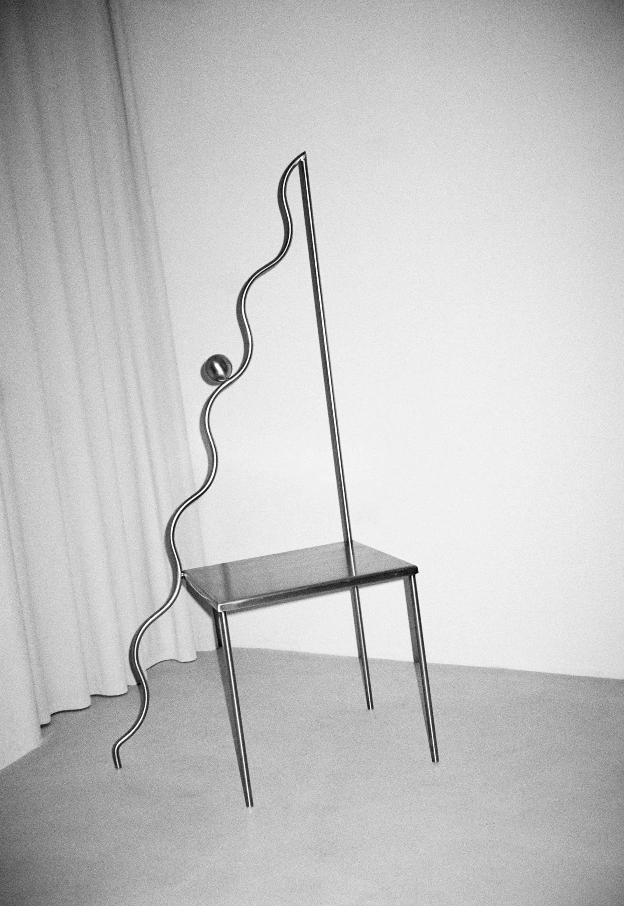 The Descending chair in stainless steel is a sculptural exploration of descent as a link between the celestial and the earthly. Through a fusion of precise geometry and organic curves, it symbolizes the meeting of order and fluidity, the infinite and the tangible. Its dynamic, motion-caught form reflects the balance between movement and stillness, while its overall presence conveys harmony and interconnectedness, reaching beyond the physical to evoke an emotional and spiritual response
