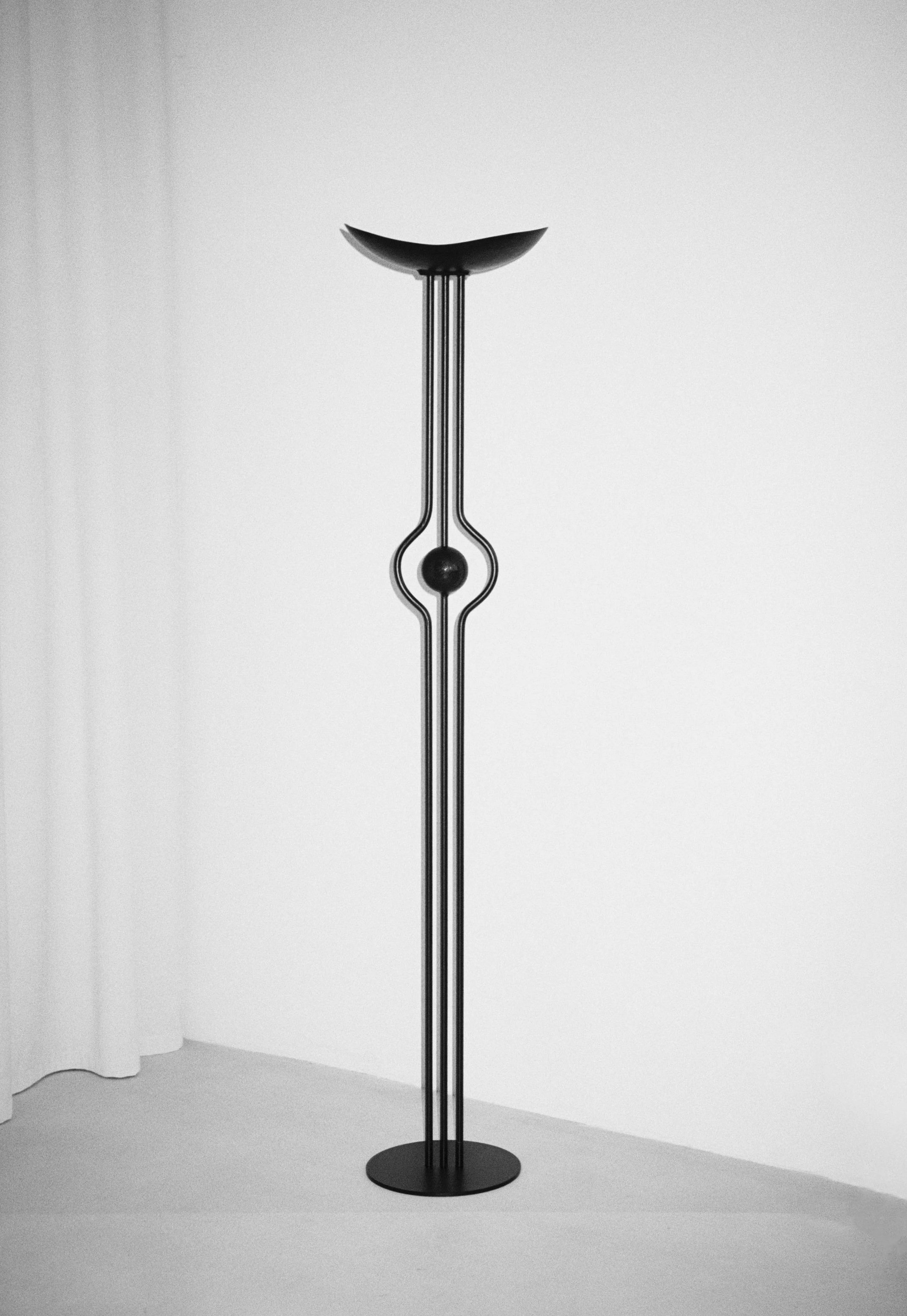 The forged iron Thurible draws inspiration from ancient Greek rituals, combining minimalist geometry with raw, elemental materials. Centered around a suspended bowl within a balanced iron framework, the piece reflects strength, craftsmanship, and ritual tradition. Conceived as a private altar, it invites pause, self-reflection, and quiet contemplation, merging ceremonial meaning with a contemporary sculptural expression.
