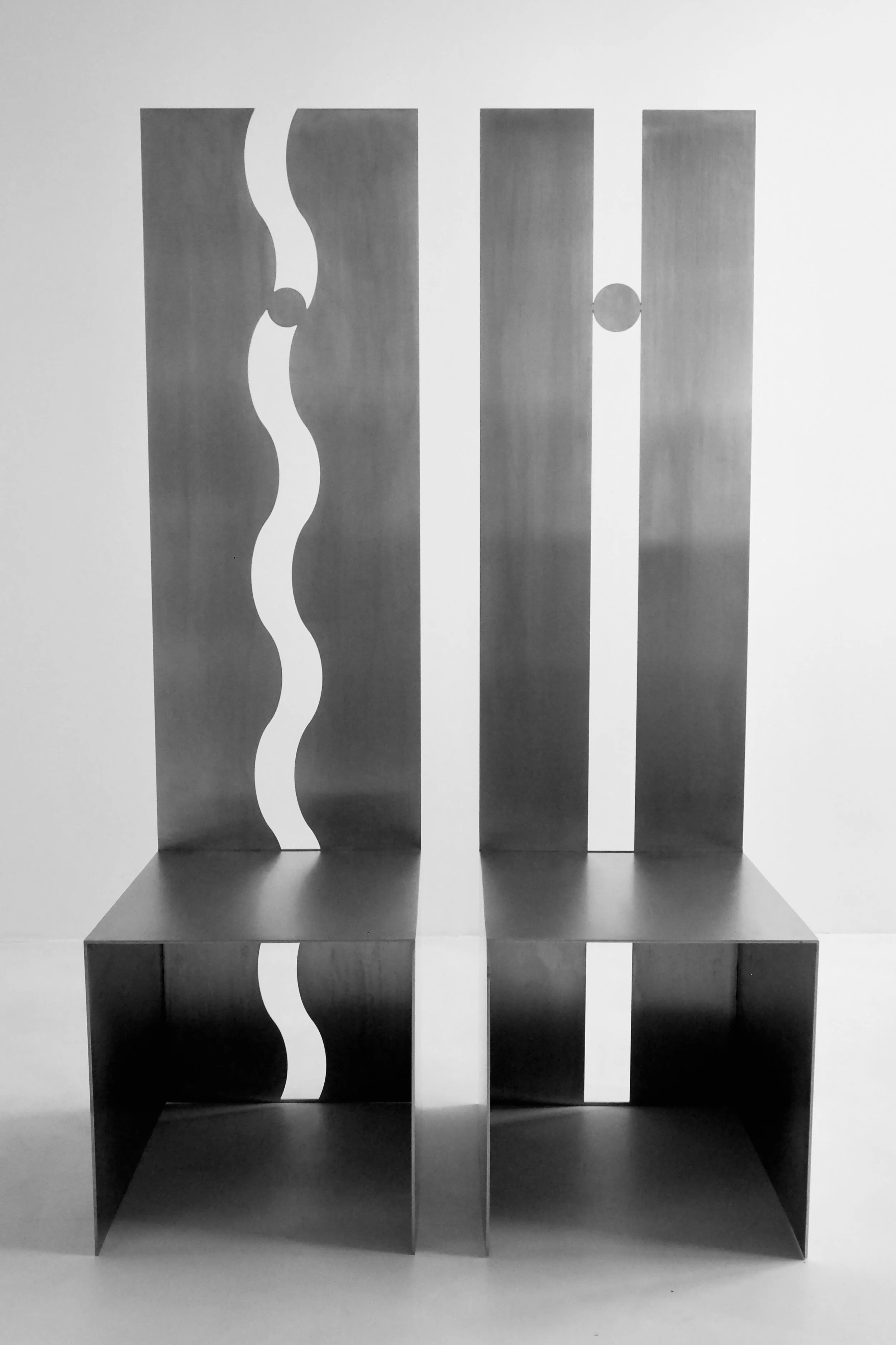 Duality is a collectible pair of stainless steel chairs that explores contrast and balance through form. One chair is defined by angular precision and stability, while the other features fluid, organic curves expressing movement and adaptability. Distinct on their own yet harmonious together, the pair reflects the equilibrium of opposing forces, with reflective surfaces enhancing light, perception, and contemplation.